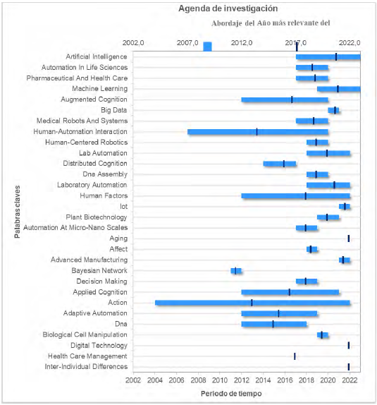 Los temas recurrentes más recientes han sido la automatización adaptativa, el ADN, la cognición aplicada y la distribución cognitiva. En lo que corresponde a los temas correspondientes a los últimos cinco años, se ha identificado un interés creciente de los investigadores por temas como: la inteligencia artificial, la técnica Machine Learning, el Big Data, la automatización de laboratorios, los factores humanos, el Internet de las Cosas (IoT por sus siglas en inglés), la manufactura avanzada, la manipulación celular biológica, las tecnologías digitales y las diferencias interindividuales [56]. Estos temas, al mismo tiempo, pueden marcar las futuras líneas de investigación alrededor de este tema.