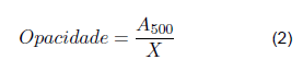 Opacidade. As análises de opacidade foram realizadas em um espectrofotômetro (Bioespectro, SP-220), em que foram realizadas as leituras de seis pontos de cada filme, como proposto [20,21]. Os filmes de amido de mandioca foram cortados em retângulos e aderidos à parede interna da cubeta do espectrofotômetro e submetidos à medição na faixa do comprimento de onda da luz visível, de 500 nm, para se obter a absorbância do filme na região do visível. A opacidade foi calculada segundo a Equação (2),