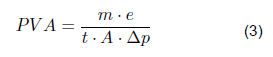 Onde: PVA : permeabilidade ao vapor de água (g.mm/h.m2.KPa); m: diferença de massa do filme (g); e: espessura média do filme (mm); t: tempo em que ocorre ganho de massa (h); A: área de permeação do filme (m2); e Δp: diferença de pressão de vapor d' água a 100 % e 0 % de umidade relativa à 25 °C e (kPa).