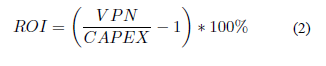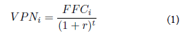 Donde VPNi, FFC1r y t corresponden, en su orden, al valor presente neto del flujo futuro de caja i, al valor futuro del flujo futuro de caja i, a la tasa de interés y al tiempo del flujo de caja. El VPNi se determina con la suma de todos los VPN. . La TIR fue determinada como la tasa para la cual el VPN reportó el valor de cero [28]. Por su parte, el R0I fue calculado con el VPN, según [29],