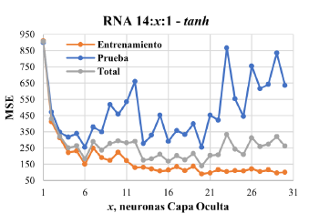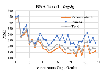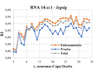 La arquitectura de RNA asumida fue la de tipo feedforward, con una capa de entrada, una capa intermedia y una capa de salida; una sola capa intermedia por lo general es suficiente para las predicciones [19]. La capa de entrada consideró 14 neuronas (variables de entrada). Por su parte, el número de neuronas de la capa intermedia fue determinada, según el menor valor de MSE. Las arquitecturas de RNA entrenadas fueron definidas como 14:x:1, en donde 14 se refiere a las neuronas de la capa de entrada, x las neuronas de la capa oculta o intermedia y 1 a la neurona de salida. El número de neuronas ocultas fue variado desde 1 hasta 30 (un poco más del doble de las entradas, según lo recomendado por Berry y Linoff [20]). Las funciones de activación utilizadas en la capa intermedia fueron la tangente hiperbólica (tanh) y la logística (logsig). Para las capas de entrada y salida, la función de activación utilizada fue la lineal (purelin). El conjunto de datos fue dividido en dos subconjuntos, el 70 % de los datos para entrenamiento, mientras el restante fue utilizado en la validación. Los desempeños para cada RNA fueron definidos en términos de los estadísticos MSE y R2, promediados en 15 etapas de entrenamiento-validación, según lo recomendado por Swingler [21].