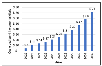 La Figura 10 presenta los costos de mantenimiento por barril incremental producido diario, resultante de la aplicación del SV con la RNA 14:23:1 - logsig. Según esta figura, los costos de mantenimiento por barril incremental día presentan un aumento durante la vida de evaluación del proyecto; los costos de mantenimiento incrementales inician en $ 5 usd y Analizan en $ 71 usd, un aumento de 12 veces. Lo anterior es una consecuencia de la tasa de declive y del bajo flujo neto de producción diario reportado para el campo del VMM. Considerando la producción anual, los costos de mantenimiento del SV por barril resultan insignificantes, entre $ 0,04 y 0,17 usd/barril, característicos de proyectos de aplicación de SV [7,9]. Por comparación, Zuluaga-Álvarez en 2020 [37] estimó una inversión total de ca. $ 6,6 MMusd y unos costos de mantenimiento de $ 66 Musd anuales para la implementación de 86 sensores de flujo tipo magnéticos de reluctancia variable (frecuencia variable entre 0-15 kHz, amplitud entre 8-190 VP-P y convertidor de frecuencia a corriente directa FDC) en pozos del campo Casabe ubicado en el VMM. La aplicación de los datos de Zuluaga-Álvarez al presente documento, cambiando el SV por sensores reales, conduciría a unos costos de mantenimiento incrementales diarios entre $ 107 usd y $ 646 usd, equivalentes a $ 0,3 y 1 usd/barril por mantenimiento anual; estos valores se encuentran por encima de lo estimado para el SV.