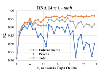Las Figuras 1 y 2 presentan los resultados de los entrenamientos y las validaciones de las RNA 14:x:1 - tanh, en términos de los estadísticos MSE y R2, respectivamente. De igual manera, las Figuras 3 y 4 muestran los resultados para las RNA 14;x:1 - logsig. De las Figuras 1 y 3 es posible inferir una mejora en el estadístico MSE con el aumento en el número de neuronas intermedias (x), para las dos funciones de activación (logsig y tanh). Por el contrario, el MSE de las etapas de validación exhibe una desmejora paras las RNA con función tanh. La función logsig conduce a una mayor concordancia entre los MSE de validación y de entrenamiento, comparada con los valores resultantes de la función tanh. Esta cercanía en desempeños entre las etapas de entrenamiento y validación manifiesta una mayor confianza en la RNA con logsig para su aplicación en predicciones con diferentes conjuntos de datos [10,31]. Según las Figura 2 y 4, el estadístico R2 de entrenamiento y total (promedio) presenta una tendencia creciente con x para las dos funciones de activación. Sin embargo, para el caso de la función logsig, el R2 reporta un comportamiento errático que afecta el desempeño reportado para 2, 4, 5 y 10 neuronas (valores por debajo de 0,9). Para la función tanh, el comportamiento errático reporta desempeños por debajo de 0,9 para la mayoría de los valores de x, reportando incluso R2 menores de 0,8 en la etapa de validación.