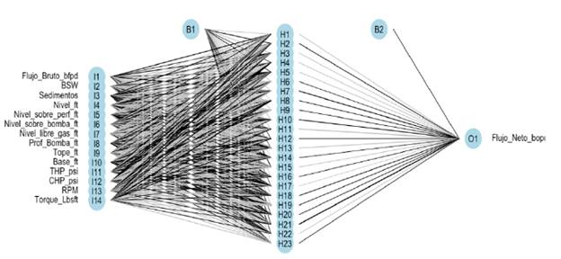 Los desempeños en la etapa de validación son importantes debido a que las RNA entrenadas (con los valores de peso definidos) son probadas con un conjunto de datos diferentes al de entrenamiento (i.e. ya en aplicación). En este sentido, el uso de la función de activación logsig conlleva a un mejor desempeño en las predicciones de las RNA. El mejor desempeño de predicción con logsig lo reporta la red con 23 neuronas (es decir 14:23:1 - logsig), obteniendo R2total= 0,956 y MSEtotal = 140,6. Por su parte, con la función tanh, el mejor desempeño es alcanzado con 20 neuronas (14:20:1 - tanh), reportando R2total =0,956 y MSEtotal =139,8. A pesar, del mejor valor de MSEtotal de la red 14:20:1 - tanh, el comportamiento errático de las RNA con tanh en validación, desfavorece su selección para un SV; en recalibraciones posteriores, este comportamiento puede conducir a una pérdida en el desempeño de predicción. Con lo anterior, la red 14:23:1 - logsig corresponde a la red más recomendada para el SV. La Figura 5 muestra la arquitectura para esta RNA.