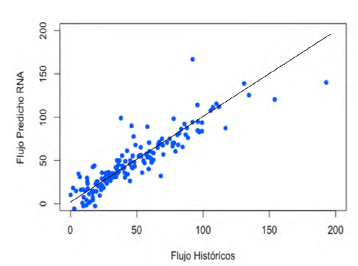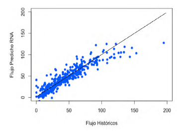 La función neuralnet (paquete Neuralnet) del programa de uso libre R fue aplicada para el entrenamiento y la validación de las RNA. En la ejecución de esta función, las opciones: algoritmo de entrenamiento con prevención del sobreajuste, función de error MSE, funciones de activación (logsig o tanh) y número de neuronas, fueron especificadas para cada estructura de RNA. Una explicación más detallada de las opciones y el algoritmo de la función neuralnet puede ser encontrada en el trabajo de Zhang [22].