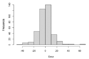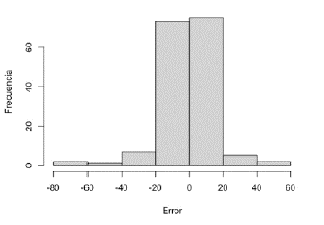 Desde luego, tanto las gráficas de paridad como los histogramas de errores presentan predicciones alejadas de los valores históricos (colas izquierda y derecha en los histogramas, Figuras 8 y 9). Sin embargo, más del 90 % de las predicciones presentan errores alrededor de 0 bopd (entre ± 20 bopd); las predicciones de la RNA con mayores errores pueden deberse a situaciones operativas de los pozos (estados inestables por mantenimientos correctivos). Es importante mencionar que los errores reportados por la RNA 14:23:1 - logsig presentan ordenes de magnitud cercanos a varios equipos de medición [32]. Los sensores comerciales de flujo de producción exhiben una exactitud entre el 5 y el 10 %, requiriendo de mantenimiento y calibración constantes [11,23,32,33]; la exactitud puede ser disminuida con sensores comerciales de mayor tecnología, elevando apreciablemente el costo de la inversión y los costos de mantenimiento [11]. Con lo anterior, en términos generales, un SV puede ser programado utilizando la red 14:23:1 -logsig, con lo cual los errores se encontrarán entre ± 23,7 bopd del valor predicho (95 % de confianza). Esta incertidumbre de ± 23,7 bopd corresponde a un error de ± 9,6 % (95 % de confianza) del valor del flujo predicho. La exactitud puede ser incrementada con la aplicación de un algoritmo de reconciliación de datos, disminuyendo los errores sistemáticos (calibración de sensores físicos y estados dinámicos) en el conjunto de datos [34] y/o por una selección de variables para la RNA por aplicación de técnicas de análisis de influencia [35,36].