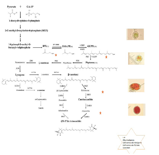 Los organismos fotosintéticos como las microalgas son de interés biotecnológico ya que se han utilizado para distintos fines como producir biodiésel, acumular metabolitos de interés, como ácidos grasos. Se han aprovechado sus capacidades para biorremediar aguas residuales, producir bioproteínas para la alimentación humana y animal, y además, se han utilizado sus propiedades para la acumulación de pigmentos carotenoides [1]. Por lo tanto, las microalgas como H. pluvialis disponen de una gran cantidad de aplicaciones, lo cual hace que posean un alto interés comercial como es la producción de astaxantina [2,3]. Actualmente la astaxantina es un pigmento utilizado en diferentes campos como la industria alimenticia, cosmética, nutraceútica, en alimentación animal y farmacéutica, y además de usarse en áreas como la ornitología y la acuicultura, se produce a nivel comercial [1,4,5]. Para el año 2028, el mercado de la astaxantina natural alcanzará los 4,75 billones de dólares, experimentando una tasa de crecimiento anual del 7,6 % durante el período comprendido entre 2022 y 2028 [5]. Estas aplicaciones se deben principalmente a su capacidad como colorante, a sus propiedades antioxidantes (inclusive en mayor proporción que el R-caroteno, alfa-caroteno, beta-caroteno y la luteína), además de ayudar a incrementar la respuesta inmune, inhibir radicales libres, tener un efecto preventivo contra el cáncer, entre muchas otras [5]. Es por esto que su uso ha mejorado la calidad de vida de diferentes seres vivos encontrados en los campos y áreas ya mencionados. La microalga H. pluvialis produce astaxantina de muy buena calidad, por lo que su producción a partir de esta microalga tiene un valor agregado para los consumidores, que no tiene la astaxantina producida sintéticamente. La astaxantina es producida por la microalga H. pluvialis de manera natural, acumulando hasta un 3 % de astaxantina en peso seco, siguiendo la ruta biosintética de los carotenoides (Figura 1). Sin embargo, la microalga tiene un crecimiento lento debido a un ciclo celular complejo que dificulta la acumulación de astaxantina [4,6-8]. El pigmento es producido bajo condiciones de estrés, siendo estas principalmente el exceso de luz, limitaciones de fósforo y nitrógeno, y el estrés causado por diferentes concentraciones de sal.