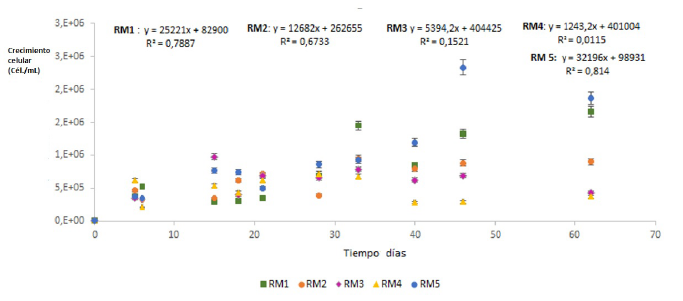 El tratamiento con mayor crecimiento celular fue el RM3 que contenía 40 mg/L fosfatos con 9.69 x 105cel/mL; El ANOVA (95 %) no estableció diferencias significativas entre tratamientos (F:0,272; P: 0,895; df: 4) (Figura 2). De acuerdo con los resultados, se evidencia que el tratamiento que obtuvo una velocidad de crecimiento mayor fue el que contenía 30 mg/L de fosfatos con un valor de 0,317 /d-1. De igual forma el tratamiento que contenía 20 mg/L de fosfatos y nitrógeno al 5 % fue el que obtuvo una menor velocidad de crecimiento con 0,009/ d-1; el control que contiene medio RM presentó 0,285/ d-1. El ANOVA (95 %) estableció que no existen diferencias significativas entre tratamientos en cuanto al recuento celular (F:0,272; P: 0,895; df: 4), sin embargo, como se mencionó previamente, el tratamiento en el cual se obtuvo un porcentaje mayor de crecimiento a los 15 días de cultivo fue el que contenía 40 mg/L fosfatos, tiempo en donde termina la fase de crecimiento exponencial. Las curvas de crecimiento mostraron un crecimiento exponencial en los tratamientos RM1, RM2 y RM3. El control presentó un crecimiento exponencial, indicando que hay un crecimiento por parte de la microalga. (Figura 2).