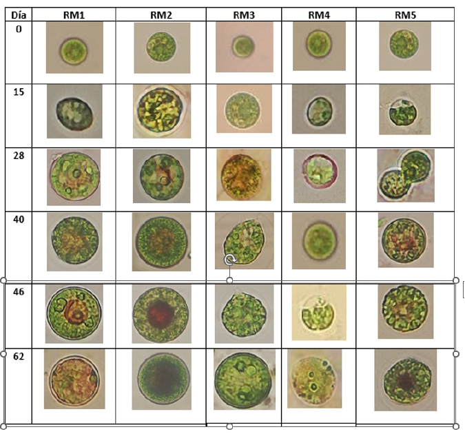 Microscópicamente, se observaron formas móviles vegetativas de color verde, en todos los tratamientos. Además, se observaron células palmellas en su etapa vegetativa de color verde en todos los tratamientos para el día 15 de cultivo, a excepción del RM4, el cual contenía células biflageladas móviles. Lo que concuerda con un crecimiento lento debido a la disminución de la concentración de fosfatos y de nitrógeno (20 mg/L de K2HPO4 y NaNO3 al 5 %). De igual forma se observaron células aplanosporas en todos los tratamientos, destacándose principalmente el RM1 y RM2, por lo que se evidenciaron todas las fases de cambio morfológico desde células vegetativas hasta aplanosporas en estos tratamientos (Figura 3).
