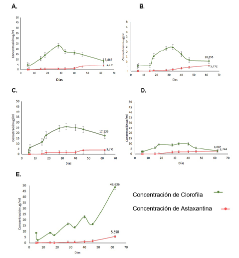 Se determinó la producción de pigmentos [1] la concentración de clorofila (clorofila a, Método APHA) y [4] la concentración de astaxantina, por método APHA [1] y HPLC [25].