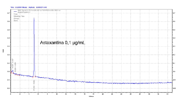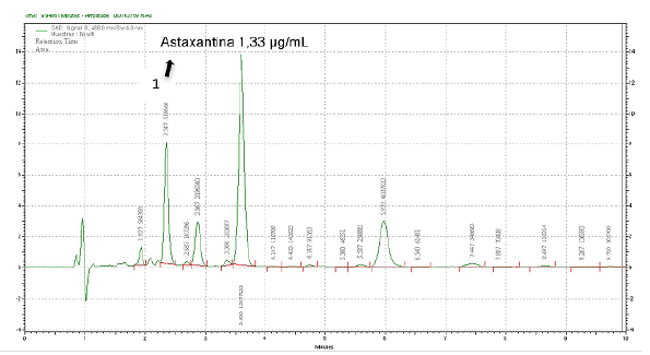 Se observó el pico estándar de astaxantina a 0,1μg/mL (Figura 5-A), demostrando que con la metodología cromatográfica empleada se logró la elución rápida del analito. Se observó que la muestra tiene una complejidad de entre 8 y 17 componentes (Figura 5-B). Se encontró una concentración máxima de astaxantina para el tratamiento que tenía 40 mg/L de fosfatos, de 1,33 μg/mL para el día 40 de cultivo (Figura 5-B), resultado cercano al obtenido por el método espectrofotométrico en la misma muestra (1,81 μg/ mL).