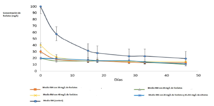 Se observó la reducción del 47,8 % de fosfatos en tratamiento que tenía 20 mg/L de fosfatos, del 55,9 °% en el tratamiento que tenía 30 mg/L de fosfatos, del 62,5 % en el tratamiento que tenía 40 mg/L de fosfatos y del 43 % en el tratamiento que tenía 20 mg/L de fosfatos y nitrógeno al 5 %. El control presento un consumo del 80,6 % de fosfatos (Figura 6).