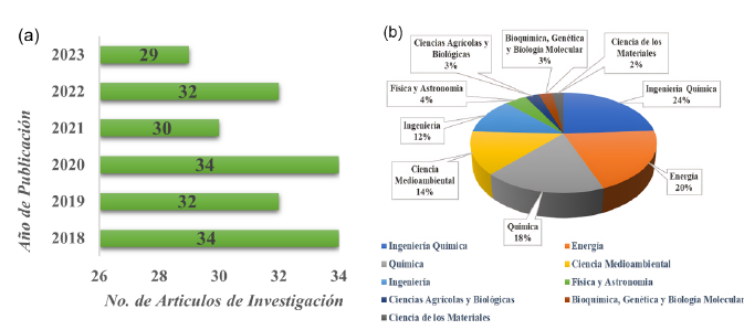 Después del proceso de búsqueda y extracción de la literatura científica se obtuvieron como resultado para el análisis 389 artículos para revisión, de los cuales se seleccionaron 101 referencias con un aporte considerable del caso de estudio, lo cual es equivalente al 25,96 % de la literatura científica clasificada, sin embargo, tras haber rechazado 288 o aproximadamente el 74,03 %%, debido a que la información de estos no cumplió con los criterios de selección indispensables para la respectiva revisión. En última instancia, la mayoría de los estudios incluidos corresponden a revisiones de la literatura científica, lo cual debido a la cantidad fue necesaria la revisión de los resúmenes de cada documentación para aplicar un filtro de primera mano y mejorar la eficiencia en la revisión del material científico, así como también se aplicó un recorrido rápido de revisión del contenido general para su respectivo análisis, con la finalidad de seleccionar de manera adecuada los artículos que correspondan con la temática del caso de estudio. La Figura 1 (a), relaciona a través de un gráfico de barras el número de artículos de investigación enfocados en reactores continuos en la producción de biodiésel en una ventana de tiempo de 6 años (2018-2023). Por otra parte, la Figura 1 (b), resalta los porcentajes de artículos de investigación publicados en el mismo lapso de tiempo según las áreas temáticas de interés. Estos datos fueron extraídos de la base de datos de Scopus, aplicando filtros para la extracción de artículos de investigación enfocados en las áreas de interés para la revisión bibliográfica.