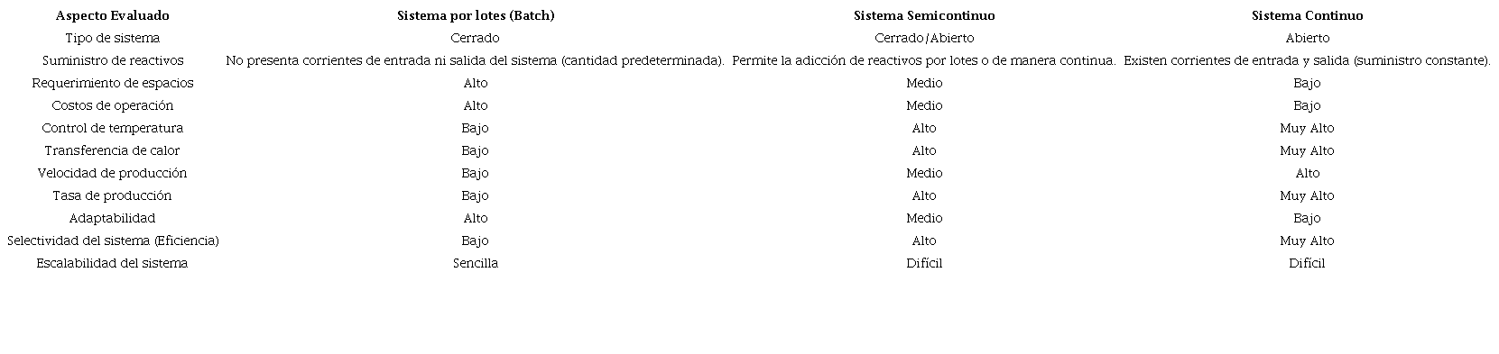 Además, dependiendo de la naturaleza química de la materia prima y del producto Anal, las condiciones operativas de cada reactor varían considerablemente. Por lo tanto, al seleccionar un reactor químico para la producción de biodiésel, es crucial considerar principalmente las condiciones de operación, requerimientos de espacio, tiempos de ejecución, volúmenes de producción, calidad, eficiencia energética y económica [50]. En cuanto a la clasificación de dichos sistemas de producción, estos se determinan en función del modo de operación del reactor de transesterificación, el cual puede ser de tres tipos: por lotes (batch), semicontinuo (semi-batch), y sistemas de producción continua [51-52]. Ante esto, la elección del tipo de sistema a implementar resulta fundamental al momento adaptarse a situaciones o requisitos específicos del sistema de producción. En la Tabla 1, se presenta una comparativa entre los diferentes modos de operación de los reactores químicos, teniendo en cuenta su aplicabilidad en los procesos de producción de biodiésel al considerar factores como el tipo de suministro de los reactivos y materia prima, los costos de operación, el control de temperatura, la transferencia de calor y la tasa o volumen de producción.