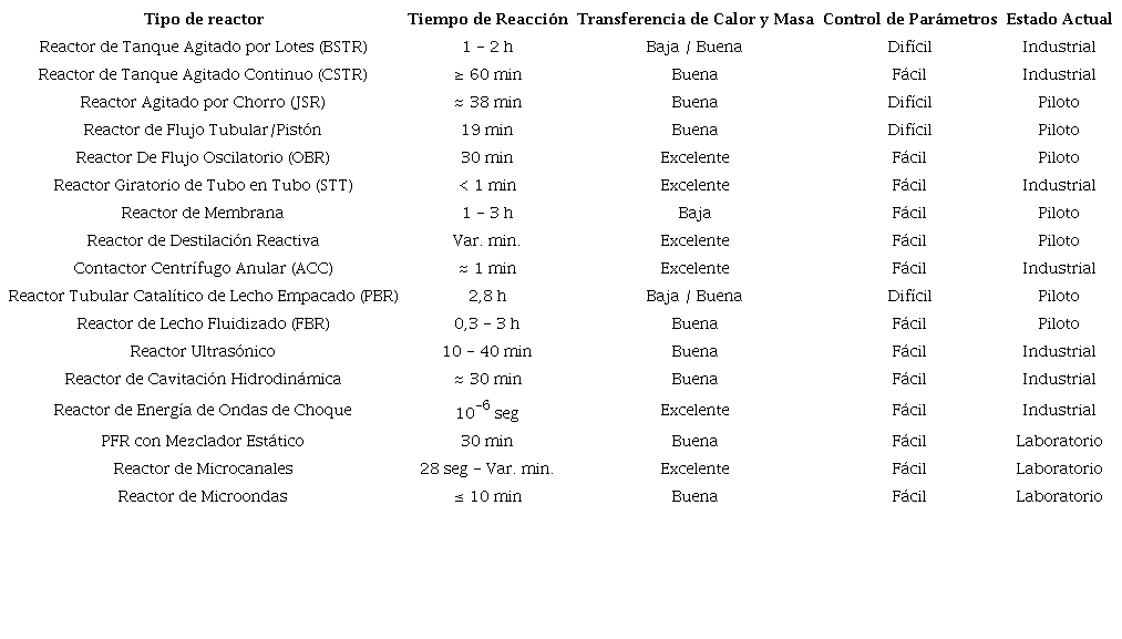 En la Tabla 2, se presentan las principales características de los diferentes tipos de reactores comúnmente utilizados en el proceso de producción de biodiésel.