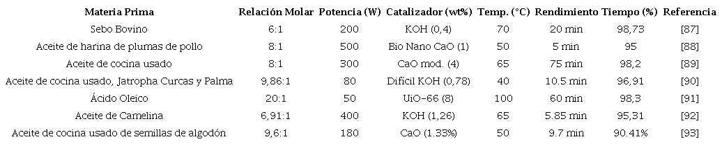 Cabe resaltar que en la Tabla 3 se presentan y analizan críticamente factores como la materia prima, el tipo de alcohol, la relación molar, la potencia, el catalizador, la temperatura y tiempo de reacción, así como el rendimiento en función de estos parámetros. Así mismo, la revisión general del estado del arte abarca ciertos estudios específicos que investigan la combinación de diversas tecnologías de calentamiento y mezclado para la producción de biodiésel, como lo es la investigación de Khedri B y Mostafaei [79]. Tal es el caso de los sistemas de radiación por microondas y microcanales, reactores ultrasónicos con sistemas de cavitación hidrodinámica y reactores de flujo tubular/pistón con reactores PBR. Ante esto, la incorporación de más de una tecnología para la generación de biodiésel permite mejorar la eficiencia en la transferencia de calor y masa tras asegurar un calentamiento o mezclado rápido y uniforme de los reactivos. En otras palabras, la tecnología de irradiación por microondas, al ser aplicada en el proceso de producción de biodiésel, ha demostrado ser una solución termoquímica efectiva que aumenta la eficiencia de la reacción.