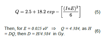 According that, fluence is determined multiplying the neutron flux by the irradiation time (in seconds) of each irradiated dosimeter and it is given in cm-2. In order to calculate the dose H, the fluence is multiplied by the effective dose conversion coefficient for whole body exposure, hE = 4E-12Svcm2 [6]. But the absorbed doses D in Gy, is required, then the quality factor Q must be considered to convert dose in Sv to Gy. Factor Q for thermal neutrons with average energy of 0.025 eV, [7] is given by Equation 5 for En< 1 MeV: