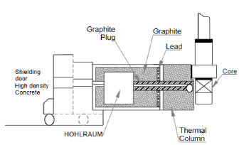 It is advisable to give some characteristics about the irradiation facility used to perform the dosimeter irradiation. The Thermal Column (CT) has an empty cavity called hohlraum, where it is possible irradiate massive samples. This facility has the peculiarity of allowing irradiation with almost only thermal neutrons. Due to the thermal column is an aluminum cube built in the concrete shielding structure, lined inside with graphite blocks, as it is shown in Figure 1. The purpose of this graphite covering is to moderate the fast neutrons tol thermal energies, also it has a lead wall to minimize the gamma radiation field inside the CT. This allos to neglect the gamma and fast neutron components.