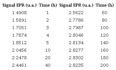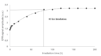 The data given in the previous table were plotted for the irradiation times from 1 to 200 hours vs the EPR signal values. Figure 3 shows that the dosimeters tend to saturation after 80 hours of irradiation.