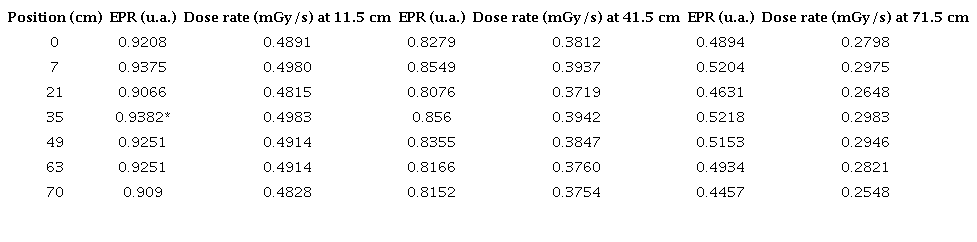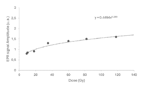 The graph above reports the amplitude of the EPR signal with dose. By adjusting with the potential H =4.49*10-1 EPR 2.68*10-1, the corresponding dose value can be interpolated for any measured EPR value.