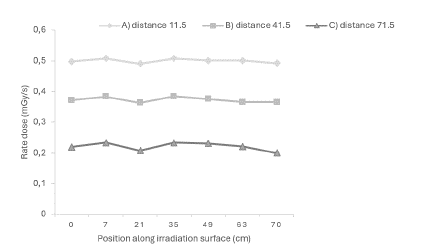 First, the distribution of doses inside the thermal column was as expected higher in the back of the thermal column and decreases as the distance increases, something important is to note that the transversal doses for a given distance, along the facility, remain almost constant.