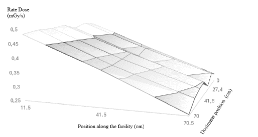 As expected, Figure 5 shows that the highest rate dose is obtained near the back of the hohlraum and decreases as the distance to the back increases. With the purpose of getting a better idea of how the doses vary with the position in the thermal, a three-dimensional plane was plotted, showing a clearer image of the dose variation inside the irradiation facility, the thermal column (see Figure 6).
