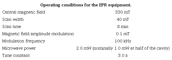 The relative concentration of free radicals was evaluated by comparing the peak-to-peak height ratio D/S [6]. The EPR operational settings are given in Table 2.
