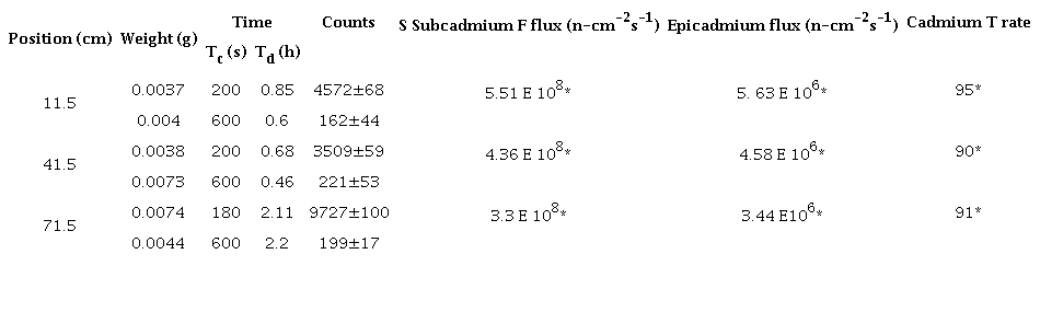 Table 3 shows the masses of the gold foils, irradiation and decay times, and measured counts, in order to calculate with the program CAFLU, the subcadmium and epicadmium neutron fluxes. The nuclear parameters for each kind of material used as detection foils are given as data in the program CAFLU, then with the values contained in the first Ave columns of Table 3, and the total efficiency of the counting system ε = 0.014, the subcadmium and epicadmium fluxes were calculated.