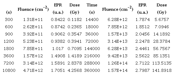 Table 5 shows the fluxes for the different irradiation positions in the holhraum. With these fluxes and the irradiation times for the irradiated dosimeters at different times, the total fluence for each group of dosimeters were calculate. Also, in the table their corresponding EPR signals are included and doses were calculated according Equation 5 and Equation 6.