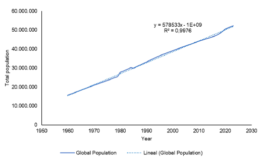Figure 1 shows the historical record of Colombian population growth based on the population registration conducted in 1973, 1985, 1993, and 2018. By analyzing this profile, it is possible to infer that the population over 60 years (19602020) has grown from approximately 15 million inhabitants to a figure very close to 50 million inhabitants, with an approximate linear growth of 580,000 new Colombians per year. This population growth rate doubled over 24 years (taking 1960 as the base year), mainly favoring urban growth. If this population growth rate remains constant over time, by the year 2050, we expect a Colombian population of about 67 million inhabitants. This figure would represent a 400 % increase compared to 1960.
