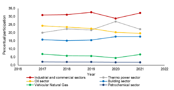 While self-sufficiency in natural gas for the current situation is assured, it cannot be established that the problem will continue in the same way in the coming years. Therefore, it is interesting to know the percentage participation of the country's economic sectors in the consumption of this energy source since fuel substitution efforts and, thus, the beginning of the path toward an energy transition may depend on this projection (Figure 10).