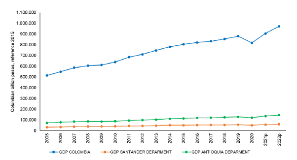 However, regional data show a stratification of this economic growth, which allows differentiation among departments with some of them having more outstanding contributions to GDP than others, and that creates significant gaps for the country's industrialization advancement. Figure 2 shows, as an example, the GDP contribution of Antioquia and Santander (Colombian departments). Sectoral growth of the energy sector in Colombia. The current Colombian energy mix shows very defined characteristics that make it possible for the country to be a net energy exporter, mainly thermal. Figure 3 and Figure 4 summarize the historical behavior of the total energy production in the country by energy source and the difference between local consumption and energy production, respectively.