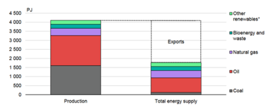 Figure 4 outlines the distribution of the final energy destination in Colombia, where it is viable to assert that approximately 55 % of the net primary energy production is destined for international markets. Thus, "...In 2023, Colombia exported 54.5 million tons of thermal coal, leaving the country as one of the top Ave international traders of this product, surpassed only by Indonesia, Australia, South Africa, and Russia..." Similarly, Colombian crude oil exports 2023 reached 190 million barrels [4].