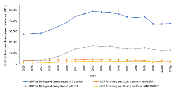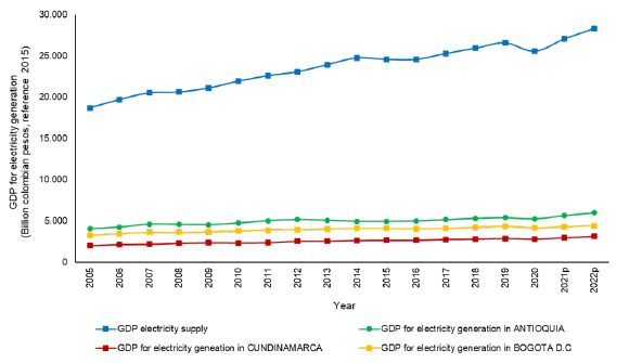 According to national statistics generated by the National Administrative Department of Statistics (DANE) [2] for the year 2022, which groups information by economic activities, the Mining and Quarrying sector (which includes extractive activities of fossil fuels) is a significant contributor to the national GDP, with three departments standing out in this regard: Guajira, Meta, and Santander. This indicates that while the country is a net energy exporter, regions contribute a significant percentage of that wealth within the administrative division, such as the three Departments above (Figure 5). Figure 6 condenses the historical behavior during the period (2000-2020) of the contribution to the GDP of the Colombian electrical sector concerning 2015. It is important to note that the regions with significant participation in this economic activity differ from those where extractive potential is the main wealth-generating activity. Antioquia, Cundinamarca, and Bogotá stand out as major contributors. This sector has an evident upward trend, with growth close to 50% during that period, reflecting the electrification of some economic activities in the country.