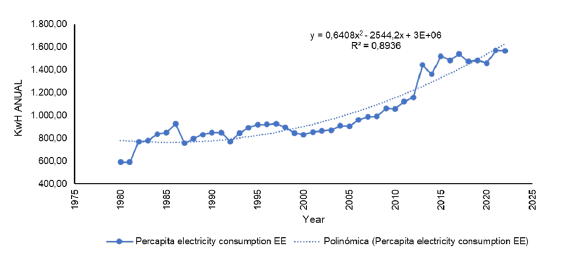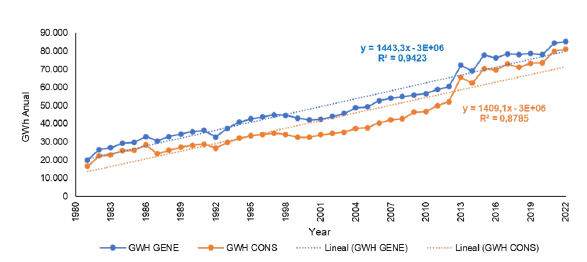 By combining the historical trend of Colombian population growth with the annual electrical energy consumption (in KWh), it is possible to preliminarily infer how per capita electrical consumption has evolved over the last 40 years (Figure 7). The result of this combination can generate a non-linear adjustment model with a quadratic expression, indicating that the country's population is immersed in increased electricity consumption, accentuated in the last 10 years. It is important to highlight the country's historical behavior of electrical generation and its consumption by economic sectors. Since modifying the Colombian electrical industry in the 1990s, the government has had a stable energy supply with high reliability despite the climatic events, given the country's tropical position. Figure 8 summarizes this behavior.