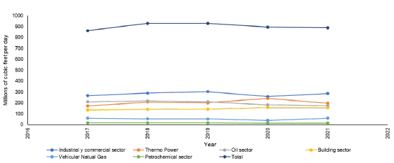 On the other hand, despite the country's primary energy export potential, when the analysis focuses on the natural gas sector, the situation is very different regarding consumption and its projection. The following figure shows natural gas consumption in Colombia during 2017-2021, measured in Million Standard Cubic Feet per Day (MMSCFD), highlighting that global consumption was stable at around 900 MMSCFD during that period. The leading consumer sectors are industrial/ commercial, thermoelectric, oil, residential, mobility with natural gas vehicles, and petrochemical. See Figure 9.