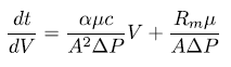 (2)Where: t is the filtration time [s]; V is the accumulated filtered volume [m3]; a the resistance of the cake [m/kg]; ¡i the viscosity of the whey [Pa.s]; c the concentration of protein in the solution [kg/m3]; A the filtration area [m2]; AP the pressure drop in the filter [Pa]; and Rm the resistance of the filter medium [m1].