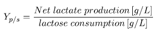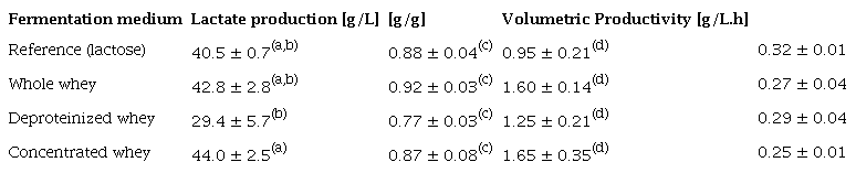 Characterization of lactic fermentation. Fermentations were characterized with 3 distinct media based on: whole (untreated) whey, deproteinized whey, and concentrated/diluted whey, together with a reference medium from reagent grade lactose, all at an initial lactose concentration (S0) of approximately 50 g/L.
