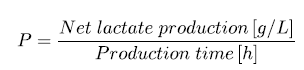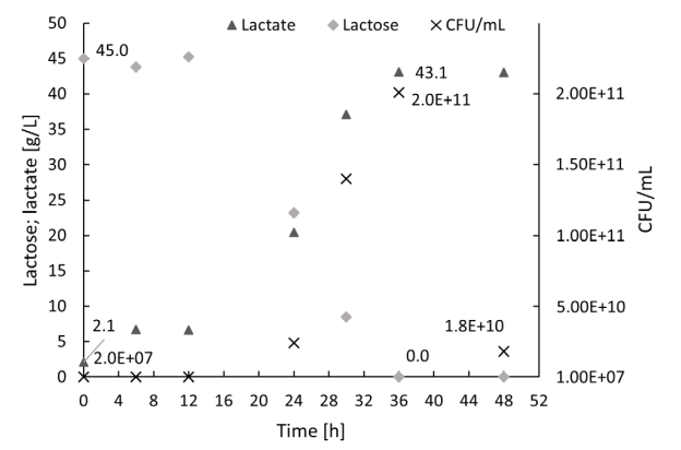 Characteristics of fermentation media. To start the fermentation, 30 mL of the preculture in the exponential phase of growth were transferred to 270 mL of each test, each one with the same concentration of nutrients in the medium (yeast extract, KH2PO4, MnSO4. H2O, K2HPO4, MgSO47H2O, MnSO4. H2O, lactose, or pretreated whey), and including 30 g/L of CaCO3 (Panreac) to maintain the pH at approximately 6.5. Fermentations were carried out in Erlenmeyer flasks of 500 mL with a working volume of 300 mL, sealed with an adaptation to avoid contamination during sampling, at a temperature of 37 °C and orbital agitation of 130 rpm. Medium samples were taken at 0, 6, 12, 24, 30, 36, and 48 h, in all tests, to quantify lactose consumption and lactate production by High-Performance Liquid Chromatography of (HPLC), and microbial growth by viable cell count. The product/substrate yield (Yp/s) was calculated using Equation 3, volumetric productivity (P) with Equation 4, and the specific maximum growth rate (umax) with the slope of the exponential phase obtained by plotting Equation 5.