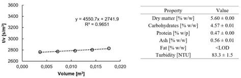 Clarification. Deproteinized whey was clarified, and the stage was characterized in terms of estimating the resistances to filtration and determining physicochemical permeate parameters. The filtration curve obtained fare shown in Figure 2, which, together with Equation 2, allowed the calculation of the resistances of both the filter medium and the cake formed and the characterization of the permeate. From the correlation shown in Figure 1, it could be estimated that the resistance of the filter medium was 1.18*10" m-1, while the resistance of the cake was 1.40*105 m/kg. From what was observed in the figure, it is concluded that the filtration was dominated by the resistance of the filter medium.