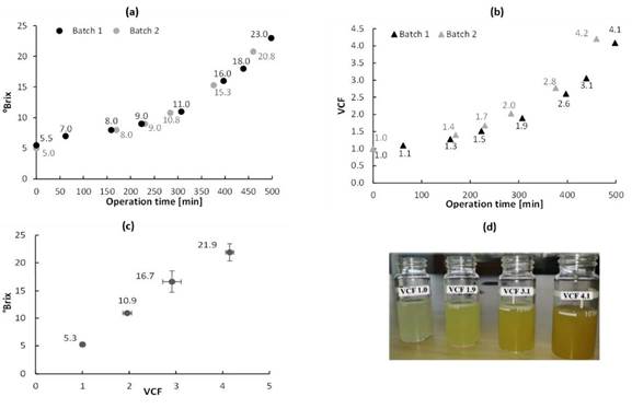 Concentration. The concentration of deproteinized and clarified whey was performed in batches of 30 L taking it to a VCF of 4. The evolution of °Brix and VCF as a function of time, as well as the relationship between °Brix and VCF and the appearance of concentrates at different VCF are shown in Figure 2.