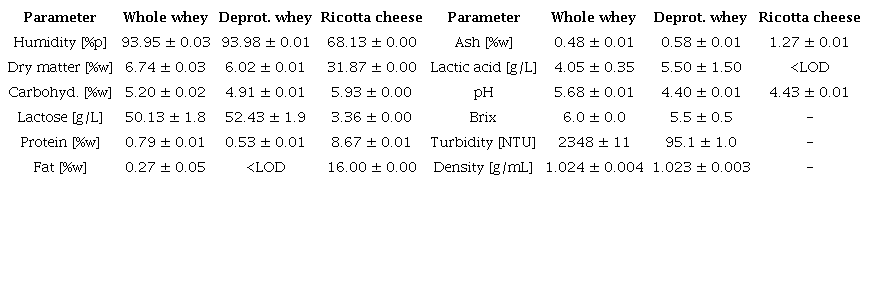 Stages of pretreatment of whey Thermal and acid denaturation. In this stage of pretreatment, a reduction of 33 % in the protein content of the whey was achieved. The physicochemical characterization of the initial and deproteinized whey and the ricotta obtained are presented in Table 1. The initial composition of acid whey is within what was reported by other authors [15,26]. In general terms, a separation of 47.1 g of wet protein/L of whey was achieved, equivalent to a yield (yD) of 4.7 %%, which is close to that reported by Vázquez-Puente et al.[13], with a (yD) of 4,9 %% in tests carried out at flask level (volume of 1 L) under the same conditions of pH, temperature, and time of the present study. Riera-Rodríguez et al.[27] achieved a yield of 5.6 %% in tests performed with sweet whey, acidified to a pH between 4.6-4.8 and a temperature between 85-90 °C, for 1 h. This 0.9 % increase in (yD), implied a 50 %% increase in processing time over the current study, which seen from an economic perspective could significantly increase the energy expenditure associated with this stage.