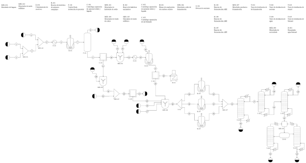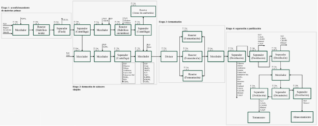 El proceso de producción de biobutanol consta de cuatro etapas globales: acondicionamiento de la materia prima, formación de azúcares simples, fermentación y, por último, separación y purificación; lo anterior se muestra en la Figura 1 (diagrama PBD). A continuación, se explicará el proceso de síntesis a través de la descripción del diagrama PFD del mismo (Figura 2).