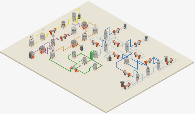 Por otro lado, en la Figura 3 se representa, por medio de un diagrama isométrico, el proceso de producción de biobutanol donde las distintas etapas están diferenciadas por colores, las líneas de color amarillo muestran el acondicionamiento de la materia prima, las líneas de color violeta y naranja la formación de azúcares, las líneas de color verde la fermentación ABE y Analmente las líneas de color azul la separación y purificación. Los diagramas PBD, PFD e isométrico son herramientas esenciales para la visualización y comprensión del flujo de materiales, la secuencia de las operaciones y la disposición de equipos, aspectos fundamentales en el diseño de plantas industriales. Estos diagramas muestran similitudes en cuanto a la representación de etapas comunes en comparación con otros estudios centrados en el uso de diferentes fuentes de biomasa, como el pretratamiento ácido, la hidrólisis enzimática, la fermentación y la destilación, que son típicas en procesos de producción de biobutanol a partir de biomasa lignocelulósica. La inclusión de un Diagrama Isométrico facilita una visión tridimensional de la planta piloto, proporcionando claridad en la disposición física de los equipos y los flujos de materiales.