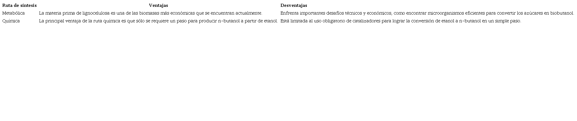 Según las descripciones anteriores, es evidente que la ruta de síntesis más apropiada es la metabólica, pues en esta la materia prima de lignocelulosa es una de las biomasas más económicas que se encuentran actualmente. La comparación de ventajas y desventajas entre la ruta metabólica y química, se muestra en la siguiente matriz de selección.