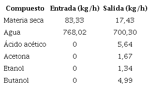 Se hizo el escalamiento de una planta con capacidad de producción de 100 kg de butanol/ mes (0,1388 kg butanol/h) con un 99,8 %> de pureza. Para esto se toma en cuenta que es necesario alimentar 8,12 kg de bagazo húmedo (70 % humedad), pues el rendimiento reportado es aproximadamente 56,98 g butanol/kg MS alimentada [5]. Se presenta en la Tabla 5 un balance de los principales componentes del proceso.