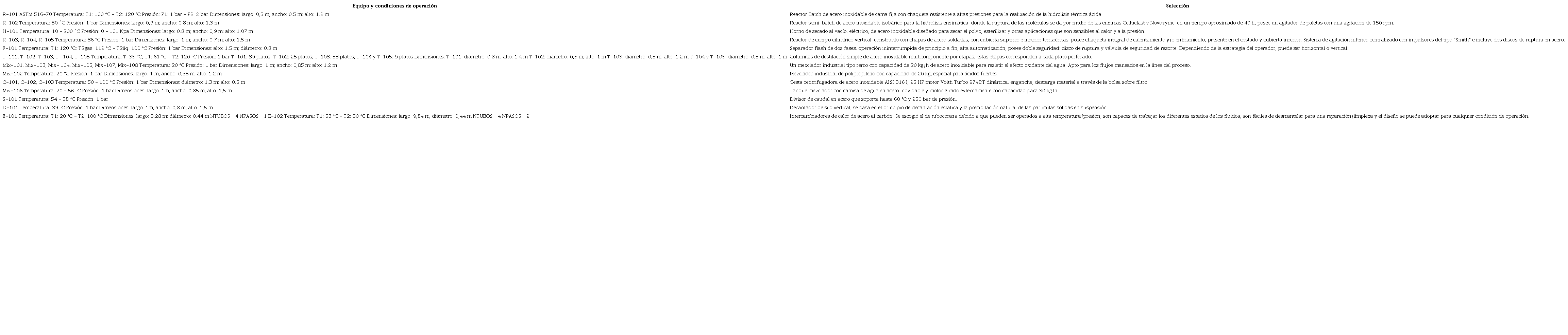 Asimismo, el escalamiento es acompañado del dimensionamiento y definición de las especificaciones de los equipos utilizados para la planta piloto, dicha información se presenta en la siguiente tabla.