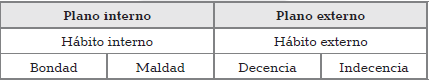 Igualmente debe llamarse la atención sobre eluso de la figura «monje», porque en este caso aparece como una alegoría para hablar del propioclérigo secular. Además, cuando sedice que el «hábito no hace», seestá negando al vestido como la única condición para reconstituir, bajo la mirada de un posible receptor, el «ser» del «monje»,haciendo falta, por presuposición, elementos indicadores de «la bondad interior de costumbres». Por último, al incluir la referenciaexplícita a la «decencia» y a la «bondad» se constituye un esquema doblementedicotómico: en el cual lo interior se puede escindir en términos de «bondad/maldad» y loexterior como «decencia/ indecencia». Conviene enfatizar lo dicho con lasiguiente tabla: