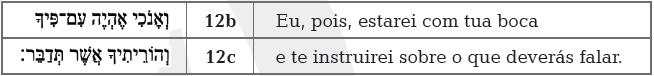 Quem discursa é o Senhor, Deus de Israel. Visando ao futuro, eleopõe ao discurso de Moisés - «Eu não sou um homem de palavras!»(Ex 4,10) - uma fala que assume características de promessa. Trata-se,sintaticamente, de duas frases paralelas que, duplamente, insistemem uma só reflexão teológica. Em primeiro lugar, a formulaçãotrabalha com uma imagem, valorizando a linguagem metonímica.Visa-se à «boca» de Moisés (Ex 4,12b), sendo que ela representa apessoa enquanto fala e/ou até precisa pronunciar-se. Aliás, a boca éo único instrumento de trabalho à disposição do profeta, sendo queeste tem a tarefa de transmitir a palavra de Deus aos demais. Enfim,acolhendo a imagem aqui descrita, a narrativa transmite a seguintepromessa divina: «Eu estarei com tua boca!» (Ex 4,12b). No segundomomento, ocorre uma formulação abstrata, formada por uma frase (Ex4,12c) que tem o objeto direto introduzido pela palavra aqui traduzida como «que» . Ou seja, a expressão «sobre o que deverás falar»se torna complemento para o que se ouve ou se lê como sujeito epredicado: «te instruirei» (Ex 4,12c). 4