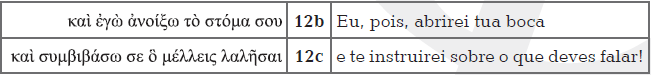 Observa-se, primeiramente, em relação a Ex 4,12b que a expressão verbal no hebraico – «eu estarei com tua boca» – sofreu uma pequena alteração, quando foi traduzida como «eu aBrirei tua boca». No mais, vale mencionar que a raiz verbal hebraica «instruir» ou «ensinar» encontra diversas traduções no grego. Verificando as quarenta e seis presenças do vocábulo na Bíblia Hebraica, os tradutores da Septuaginta usaram os seguintes verbos gregos para traduzi-lo: «encontrar, reunir-se» (ver συναντάω em Gn 46,28), «reunir, unir, unificar, demonstrar, provar, instruir, ensinar, advertir»